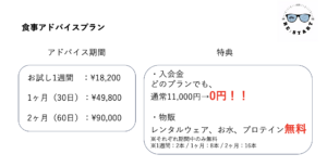 RE:START GYMでは、最短1週間からお試しで食事アドバイスを行っておりますので、今後の自分のために知識を付けたい方はぜひこちらもオススメです!
